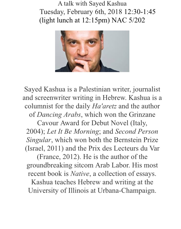 Sayed Kashua is a Palestinian writer, journalist, and screenwriter writing in Hebrew. Kashua is a columnist for the daily Ha’artz and the author od Dancing Arabs, which won the Grinzane Cavour Award.
